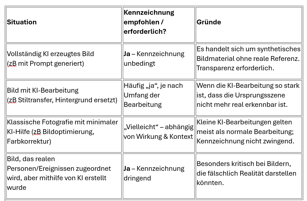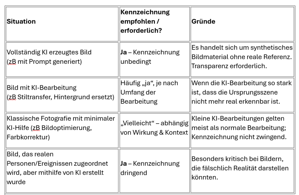 Wenn ein Bild nicht mehr klar von einer echten Aufnahme unterschieden werden kann, oder wenn KI-Technologie wesentlich zum Entstehungsprozess beigetragen hat – dann sollte eine Kennzeichnung erfolgen.